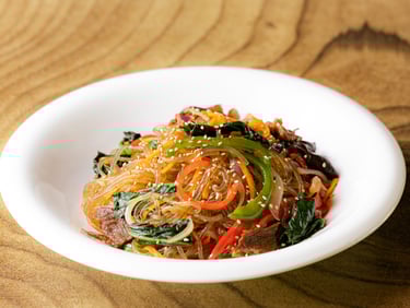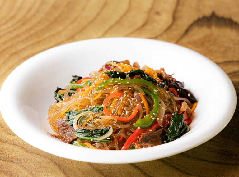 Stir-fried glass noodles with marinated beef, seasonal vegetables, and sesame oil.