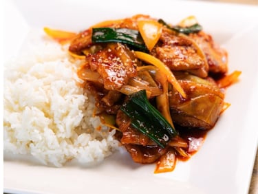 Grilled marinated pork with a sweet and savory Korean BBQ sauce.