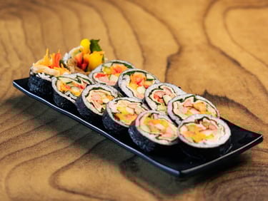 Rice roll with vegetables, fish cake, pork sausage, and egg wrapped in seaweed.