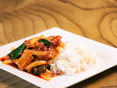 Rice bowl topped with spicy stir-fried pork and vegetables