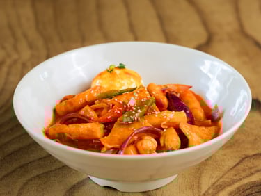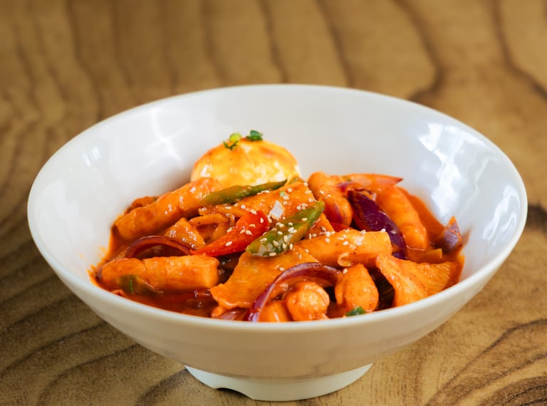 Stir-fried rice cakes in sweet and spicy gochujang sauce.